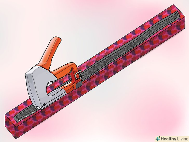Залишком тканини "обийте" дошку 2,5 см x 5 см. якщо чесно, ця частина не обов'язкова.- Штора буде прекрасно працювати і без обшивки на дошці... просто вигляд буде не такий гарний! У всякому разі, якщо ви вирішили прикрити її... оберніть її так само як загортаєте подарунки... просто замість стрічки використовуйте скоби! Підверніть кінці і теж акуратно скріпіть!