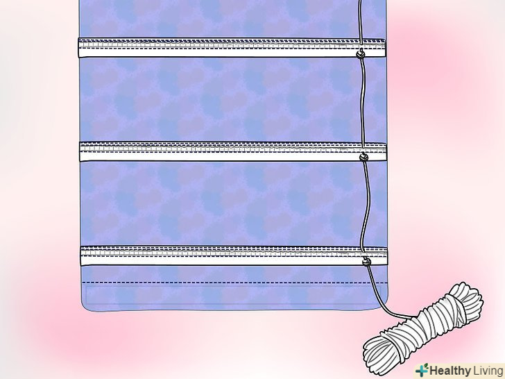 Зв'яжіть все разом нейлоновим шнуром. Вирішіть, з якої сторони буде ваш підвісний шнур (сторона, що буде піднімати штору) і починайте працювати з протилежного боку штори.- Вам знадобиться в'язати громіздкі вузли-і це важливо, оскільки вам не захочеться, щоб вузол випадково прослизнув через петлю шторної стрічки.