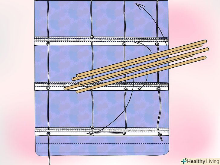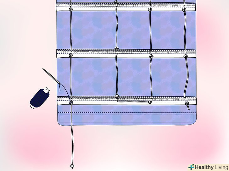 - Можна пов'язувати його приблизно в три рази, а потім пропустити шнур через велику тупу голку. Знову ж таки, починайте з протилежного боку від тієї, де буде підвісний шнур. Відміряйте 5 см від краю і пропустіть голку через петлю в нижньому ряду шторної стрічки.
