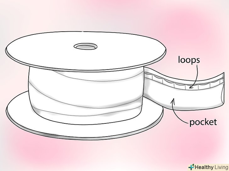 Майте на увазі, що шторна стрічка - дивовижний продукт, уздовж верхньої частини, якого знаходяться маленькі петлі, куди можна всунути нейлоновий шнурок (як показано зверху), і уздовж нижньої частини - кишеньку (як показано внизу), куди можна вставити стрижень.- Якщо ви все ще не знаєте, що саме шукаєте, попросіть в магазині тканин шторну стрічку для римських штор, і, будемо сподіватися, вони знайдуть те, що вам потрібно.