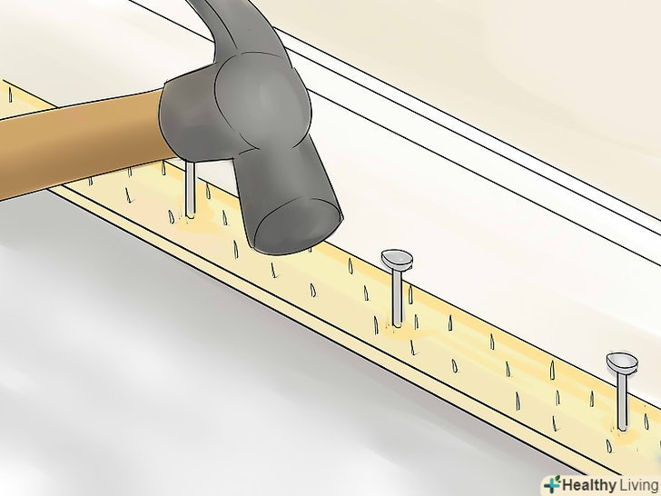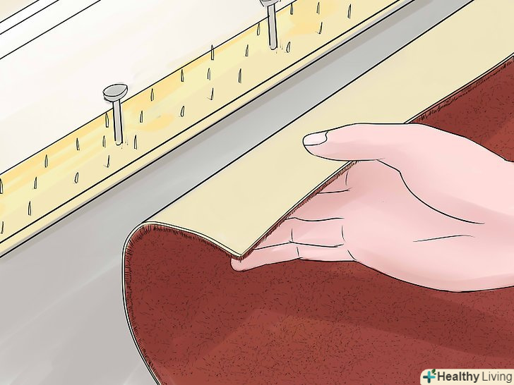 Встановіть рейки для кріплення ковроліну. відріжте рейку канцелярським ножем так, щоб її довжина дорівнювала довжині стіни, і прикріпіть її до стіни за допомогою цвяхів для кріплення до кам'яної кладки. Елементи для кріплення ковроліну повинні бути спрямовані до стіни. Залиште між рейкою і стіною зазор товщиною, що відповідає висоті ворсу, – туди ви будете заправляти краю ковроліну в процесі укладання.
