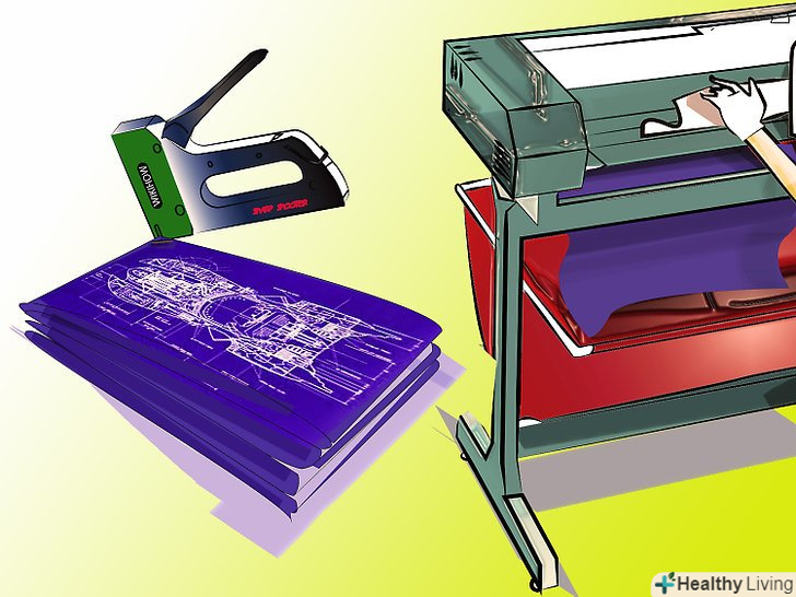 Створіть палітурку з одного аркуша діазотіпного паперу. після того, як всі копії зроблені, якщо ви хочете, можете запустити один аркуш діазотипного паперу без будь-яких зображень. Це зробить лист дуже темно-синім. Цей лист потрібно розрізати на смужки тієї ж висоти, що і ваші креслення, але тільки потрібно зробити його досить широкими смужками, щоб на ньому вийшло три складки для палітурки з одного боку ваших креслень. Зазвичай 3 – 4 Скоби з потужного пістолета-це все, що необхідно для забезпечення палітурки і утримування креслень разом.