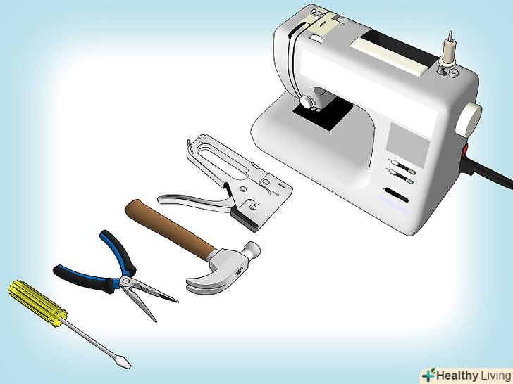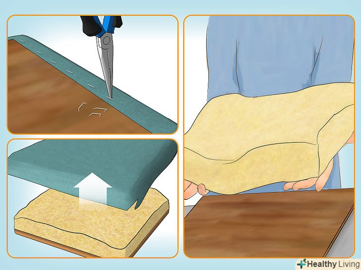 Зніміть стару оббивку з меблів. повільно і ретельно витягніть всі скріпки/цвяхи/шурупи, що фіксують оббивку, і складіть їх туди, де вони не загубляться. Скріпки витягніть за допомогою викрутки або ножа для масла. Знімаючи стару оббивку, не розрізайте її – вона знадобиться вам, коли будете вирізати оббивку з нового матеріалу.- Якщо ви знімаєте оббивку з дивана, вам доведеться перевернути його і зняти кріплення оббивки знизу і ззаду.