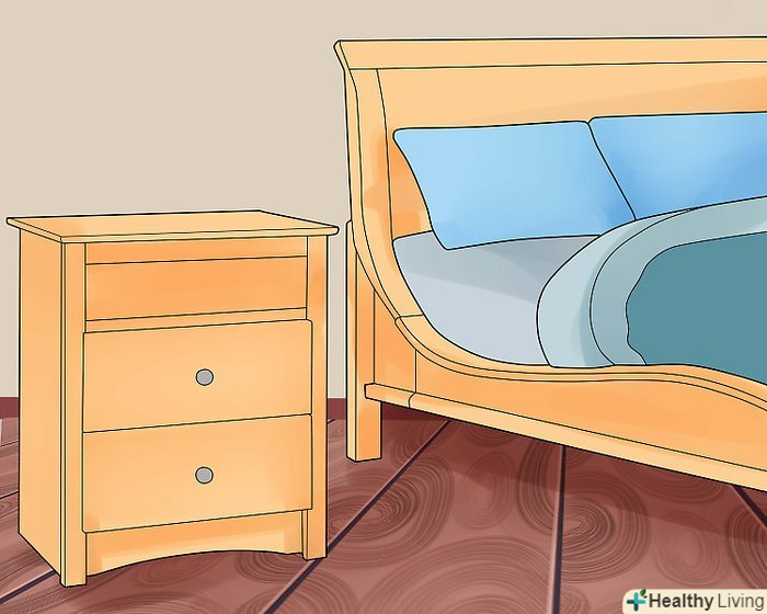 Поставте тумбочки біля ліжка. після того як ви вибрали місце для двох найбільших предметів меблів, ви можете почати заповнювати кімнату іншими предметами меблів. Обов'язково придбайте тумбочки. На них ви зможете поставити або покласти багато речей: будильники, лампи, книги, телевізійний пульт, мобільні телефони, стакан води і все інше, що може знадобитися вам, коли ви лежите в ліжку. Поставте дві тумбочки по обидві сторони від ліжка. Висота тумбочки повинна відповідати висоті вашого ліжка з матрацом. [9]- Тумбочки бувають різних форм, розмірів і кольорів. Подумайте про те, яку функцію буде виконувати ваша тумбочка. Ви хочете, щоб ця тумба була з полицями? Ящиками? Або без цих елементів? Виберіть тумбочку, яка буде відповідати вашим потребам.