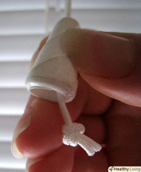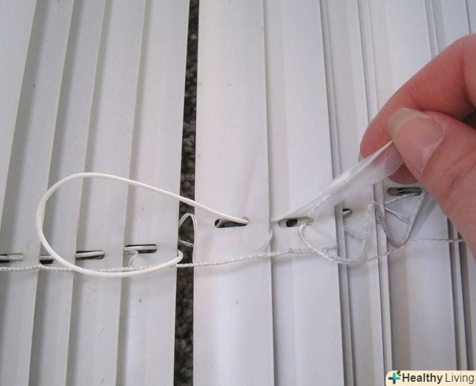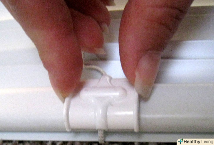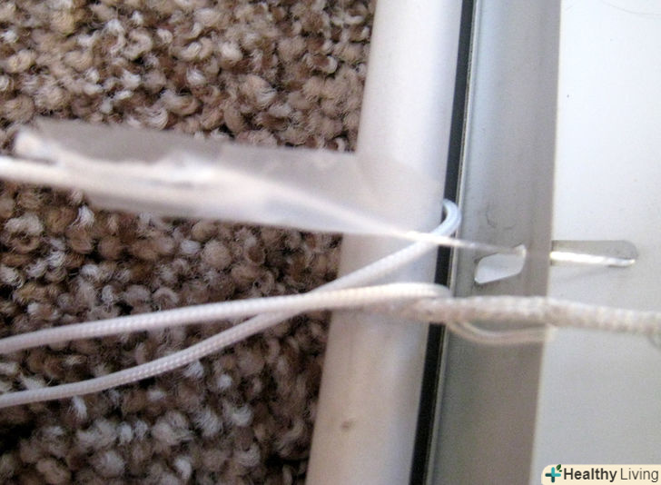 - Слідуйте за непошкодженим шнурком. Починаючи від пензлика (пластикова частина, за яку Ви смикаєте), більшість шнурків йдуть вгору через порожнистий жолоб у верхній частині жалюзі, а потім вниз через ряд отворів в планках. Там вони надійно зав'язані внизу паза, який піднімається і опускається, коли ви відкриваєте або закриваєте жалюзі.