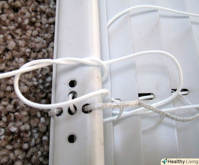 Зав'яжіть шнурок на нижній рейці. Зв'яжіть його міцно через отвори так, щоб вузол не зміг через них пройти. Ці жалюзі мають пару отворів, до яких можна прив'язати шнурок. Деякі жалюзі можуть йти разом з невеликою шайбою або вушком, до якої прив'язується шнурок. Замініть його, якщо у вас він є. В іншому випадку зав'яжіть вузол досить великого розміру, щоб він не пройшов через отвір.- Закрийте жалюзі і залиште трохи довжини з тієї сторони, де вони тягнуться. протягніть Додаткові шнури і зав'яжіть їх.