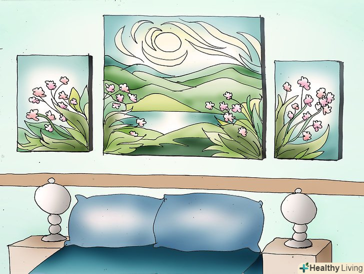 Розмістіть надихаючі вас предмети мистецтва в своїй спальні. повісьте зображення заспокійливих сцен природи або певних місць, які вас надихають. Виберіть нейтральний пейзаж, зображення, яке мотивує вас до досягнення вашої мрії, або щось, що налаштовує вас на спокійний і мирний лад. Занадто графічним, лякаючим, тривожним зображенням не місце в спальні. Помістіть найбільш надихаюче зображення навпроти ліжка, щоб воно було першим, що ви бачите, прокидаючись. [7]