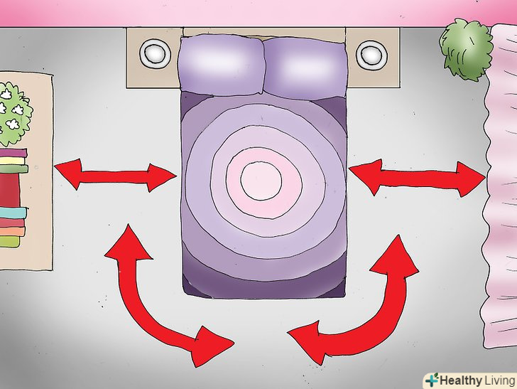 Прагніть до рівності. постарайтеся залишити рівне місце по обидві сторони від ліжка та інших предметів меблів. В межах розумного, Ви повинен бути в змозі без праці пройти по обидва боки кімнати. Звичайно, предмет меблів може порушити рівновагу, але в цілому намагайтеся не перевантажувати одну сторону спальні, або ви створите дисбаланс в найбільш важливій кімнаті будинку.