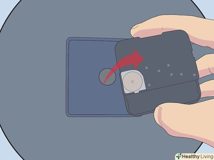 Встановіть новий годинниковий механізм. Встановіть новий годинниковий механізм на місце старого. Будьте обережні, щоб не пошкодити циферблат, коли будете вставляти новий годинниковий механізм в його центральний отвір. [14]