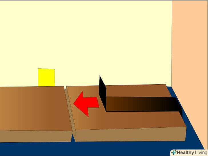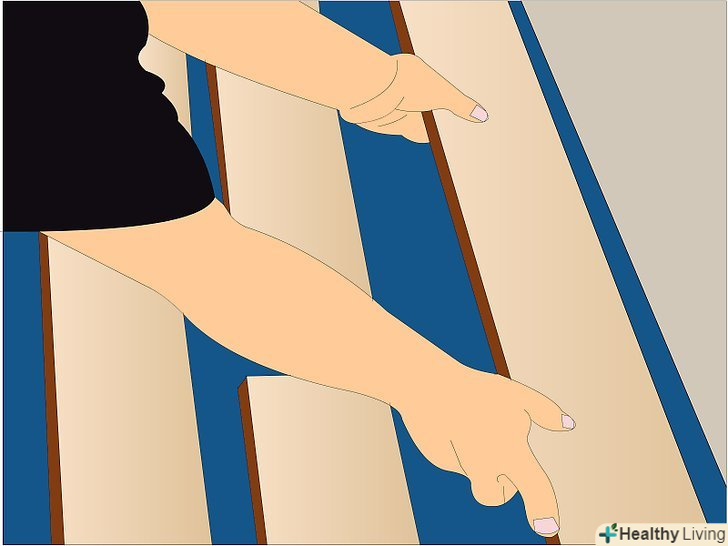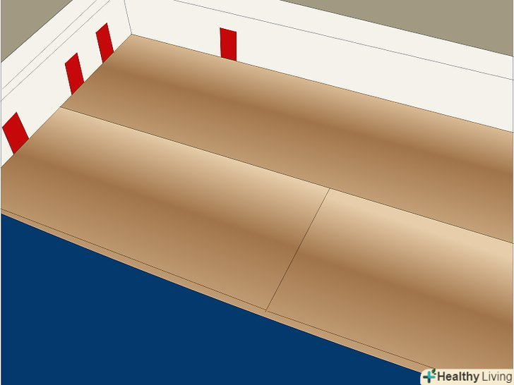 Помістіть 7.94 міліметрові розпірні клини біля стіни, що знаходиться далі всіх від дверей. розташуйте першу дошку покриття пазами до стіни таким чином, щоб вона щільно прилягала до розпірних клинів. Потім покладіть наступну дошку до краю першої дошки.- Для чого потрібні розпірні клини? Паркет, як і ламінат, можуть розширюватися і звужуватися під впливом температурних змін. Наявність невеликого простору між краєм покриття і стіною дає можливість уникнути виникнення тріщин при подібних змінах. [1]