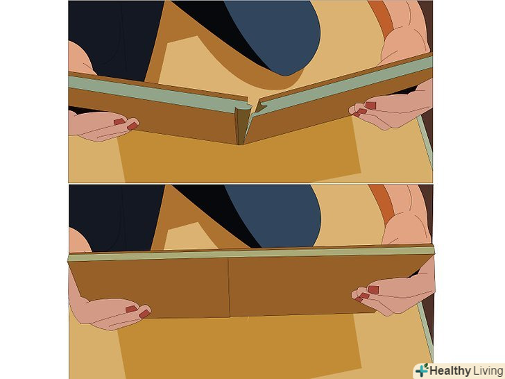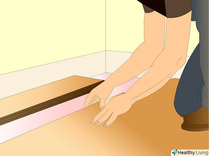 - Якщо у вас виникли проблеми з підгонкою останньої частини через стіну, то ви можете від'єднати передостанню дошку і спочатку укласти останню панель. Після того як остання панель укладена і щільно прилягає до розпірного клину, поверніть відсутню дошку і закріпіть пази. [2]