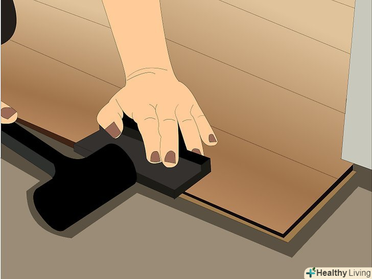З'єднайте пази двох дощок. прикладіть підбивний брусок або дерев'яний брусок до другої дошки і постукайте по ньому молотком, підбиваючи одну дошку до іншої. Продовжуйте повторювати цю процедуру по всій довжині уздовж стіни.- Якщо у вас є молоток з гумовим набалдашником на кінці, тоді вам не знадобляться кромка і брусок такий молоток мінімізує пошкодження дерев'яних виробів.