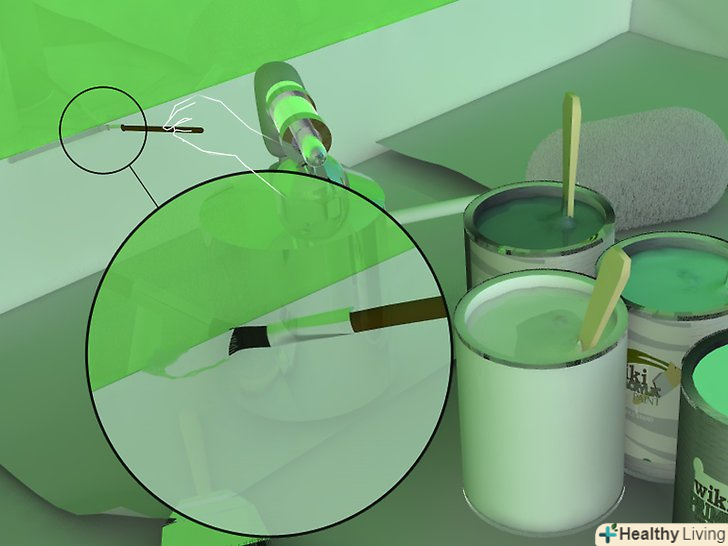 Пензлем фарбують так:- Опустіть кисть на 2,5 см в ємність з фарбою (підійдуть навіть залишки фарби, яку ви наливали для роликової кисті). Якщо занурювати кисть глибше, це збільшить витрату фарби, і кисть відмити буде складніше.