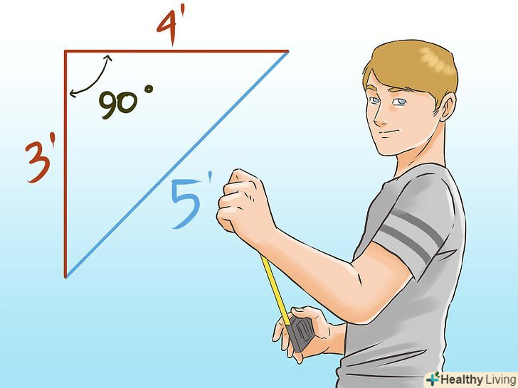 Відміряйте чотири метри (або довжину зі значенням, яке кратно чотирьом) на іншій стороні. те ж саме, якщо у вас вийде зробити трикутник, то кут між цими двома сторонами буде дорівнює 90 градусам. Знову позначте відміряний ділянку точкою.