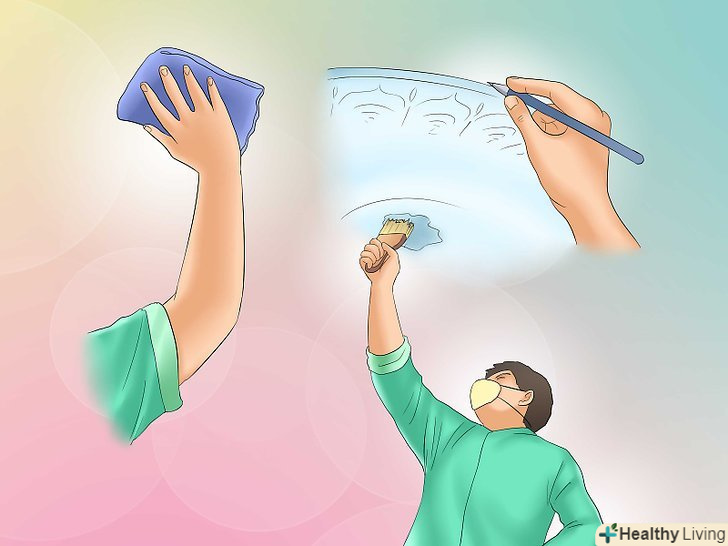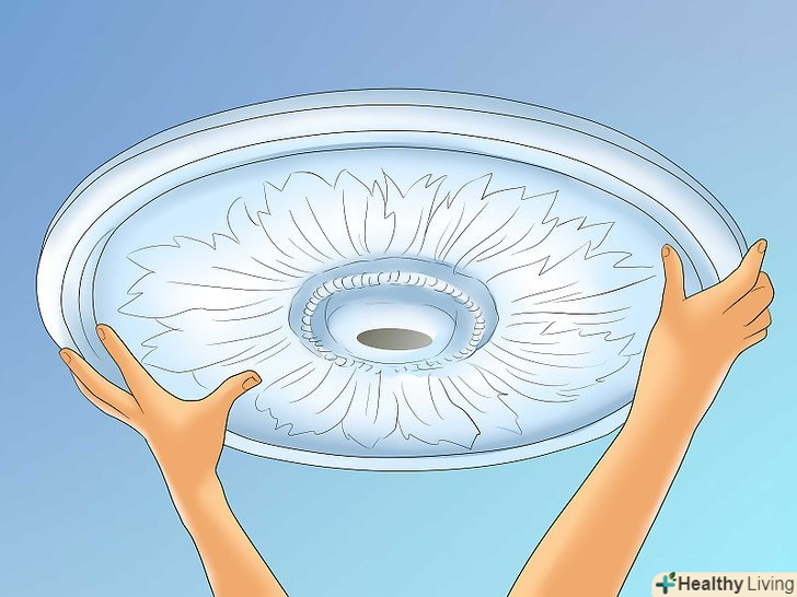 Протріть поверхню стелі чіпкою тканиною. заберіться на драбину. Попросіть кого-небудь прикласти розетку до стелі в потрібному вам місці і обведіть її обід олівцем.- Відкладіть розетку в сторону і змастіть стелю клеєм.
