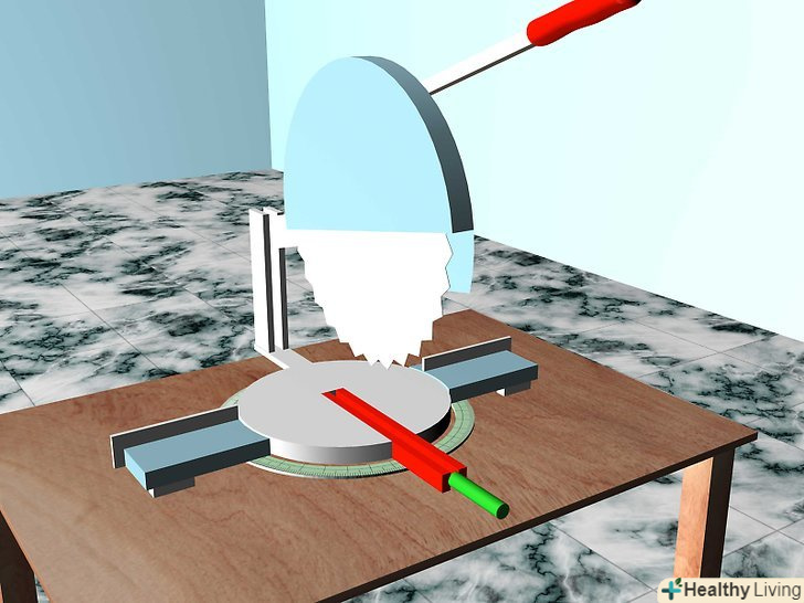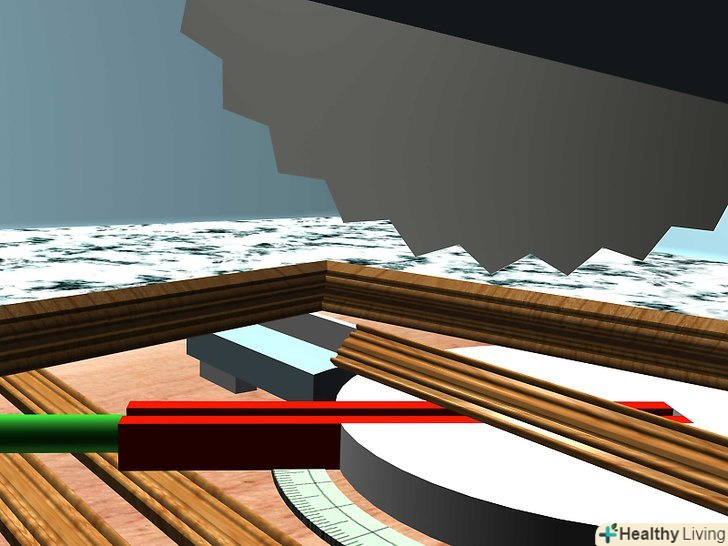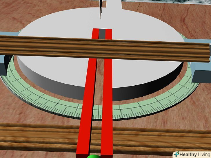 - Візьміть шматок фанери або розмірний пиломатеріал довжиною рівній вашому столу верстата. Нанесіть гарячий клей на стіл верстата з двох сторін і накладіть фанеру на клей, щільно придавлюючи до плінтуса. Коли клей засохне, приберіть плінтус і скористайтеся верстатом для обрізки центральної частини фанери під кутом 45º.
