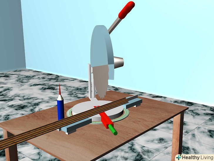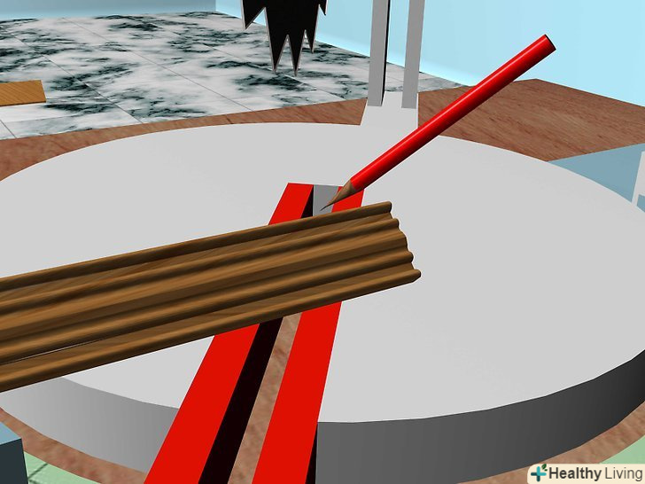 Зробіть напрямну лінійку для вашого різального верстата. оскільки плінтус буде встановлюватися на стіну під кутом, кожне з'єднання (це місце, де дві частини плінтуса зустрічаються) буде складати складний кут. Плінтус повинен бути зрізаний під кутом 45 º і скошений так, щоб дві сусідні частини щільно прилягали. Досягти цього двома окремими зрізами дуже складно, тому тут ви навчитеся обрізати обидва кути одним розпилом. Для цього вам потрібна напрямна лінійка-це шматок фанери, приклеєний до столу вашого верстата, який допомагає поміщати плінтус точно на одному місці для кожного шматка.- Покладіть шматок плінтуса в перевернутому вигляді на стіл верстата. Сторона плінтуса, яка буде прилягати до стелі, повинна бути звернена до верстата, а сторона, прилегла до стіни, повинна бути звернена до вертикальної направляючої верстата. Переконайтеся, що сторона з декоративним візерунком дивиться на вас, і тримайте плінтус під таким же кутом, під яким буде встановлюватися. Закріпіть плінтус затискачами до вертикальної направляючої.