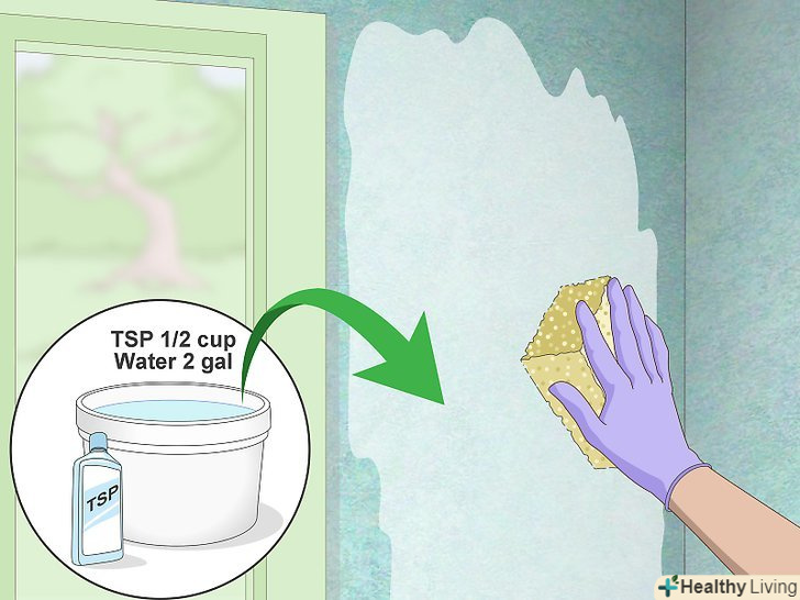 Ретельно очистіть стіни ортофосфатом натрію. Ортофосфат натрію або натрієва сіль ортофосфорної кислоти — це засіб для чищення, який дозволяє позбутися від непотрібних масел і хімічних речовин в шпалерах і отримати чисту поверхню під фарбування. На 8 літрів води додайте половину склянки ортофосфату натрію. Обробіть стіни миючим розчином за допомогою м'якої губки або малярської кисті. [1]- Ортофосфат натрію можна купити в господарському або будівельному магазині.