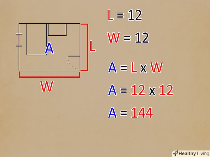 Помножте довжину на ширину, щоб знайти площу всієї кімнати. наприклад, якщо довжина кімнати дорівнює 12 м, а ширина – теж 12 м, то площа кімнати дорівнює 144 м2. Запишіть це значення на плані.
