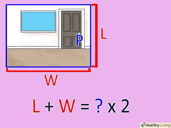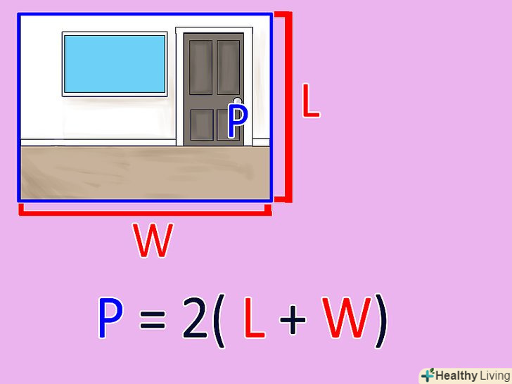 За допомогою рулетки виміряйте довжину і ширину квадратної або прямокутної кімнати. Периметр = 2 * (Довжина + ширина). [6]