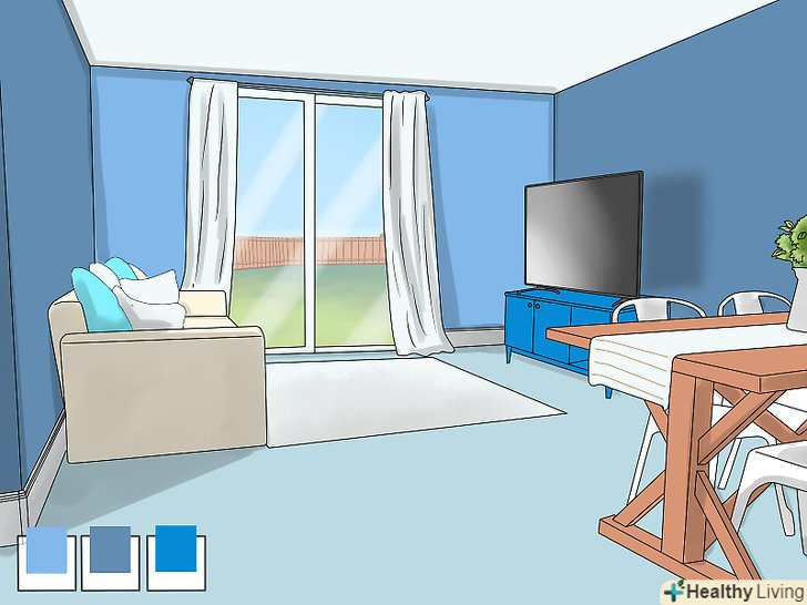 Досягніть однаковості, застосовуючи різні відтінки одного кольору. визначившись з кольором однієї кімнати, виберіть інший колір на один тон світліше або темніше. Знайдіть спосіб включити цей колір у сусідні кімнати. Це додасть інтер'єру візуальну зв'язаність, не позбавляючи оригінальності. Цей же колір можна використовувати для вибору інших поєднаних кольорів і колірних акцентів, які додадуть кожній кімнаті свій унікальний характер. [18]- Наприклад, ви пофарбували кімнату в синій базовий колір з білими елементами обробки. Уникайте застосування такого ж синього кольору в іншій кімнаті. Замість цього спробуйте пофарбувати стіни в білий колір і використовувати для обробки більш світлий синій тон.