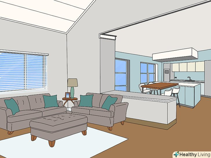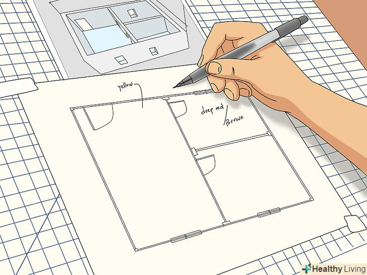 Зверніть увагу на те, які кімнати і приміщення є суміжними. при створенні інтер'єру будинку ваша мета полягає в тому, щоб кімнати здавалися пов'язаними один з одним. Для цього використовувані вами кольору фарб повинні поєднуватися між собою. Пройдіться по будинку, складіть план приміщень і зробіть необхідні позначки, не забуваючи про те, що навіть віддалено родинні кольору впливають на атмосферу сприйняття кімнати. [15]- Наприклад, якщо ви пофарбуєте кімнату в темно-червоний і темно-коричневий кольори, провідний до неї яскраво-помаранчевий коридор буде сильно відрізнятися від колірної гами кімнати. Можливо, має сенс зробити коридор блідо-жовтим, щоб він не був настільки помітним.