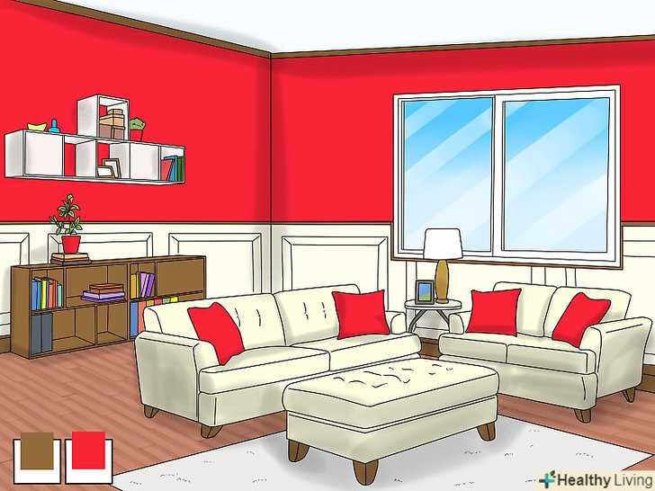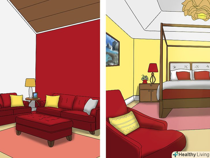 Чергуйте приглушені і яскраві кольори в кімнатах. існує багато різних підходів до створення інтер'єру, але чергування кольорів робить обстановку більш цікавою. Фарбування всіх кімнат в один колір виглядає занадто монотонно. Постарайтеся надати кожній кімнаті індивідуальне візуальне сприйняття. Десь введіть більш темні кольори, десь поверніться до більш соковитим тонам, щоб оку було за що зачепитися. [17]- Наприклад, пофарбуйте вітальню в яскраво-червоний колір. Суміжну кімнату пофарбуйте в світло-жовтий. Доповніть його червоним і коричневим декором, щоб надати обстановці завершеність.