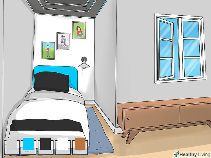 Виберіть один переважаючий колір, щоб надати кімнаті конкретний характер. переважаючий колір кімнати є її основним кольором, тому приділіть належний час роздуму про те, як саме повинна виглядати ваша кімната. Даний колір, найімовірніше, буде розташовуватися на стінах. Можливо, ви також захочете підібрати меблі і декор в такому ж кольорі, щоб підкреслити єдину колірну схему. [8]- Так як стіни є найбільшою колірною основою кімнати, почати роботу з їх фарбування буде простіше, але це не строго обов'язково. Якщо ви збираєтеся використовувати дуже яскравий переважаючий колір, то спочатку можна придбати аксесуари того ж кольору, а вже потім пофарбувати стіни, щоб вони доповнювали один одного.
