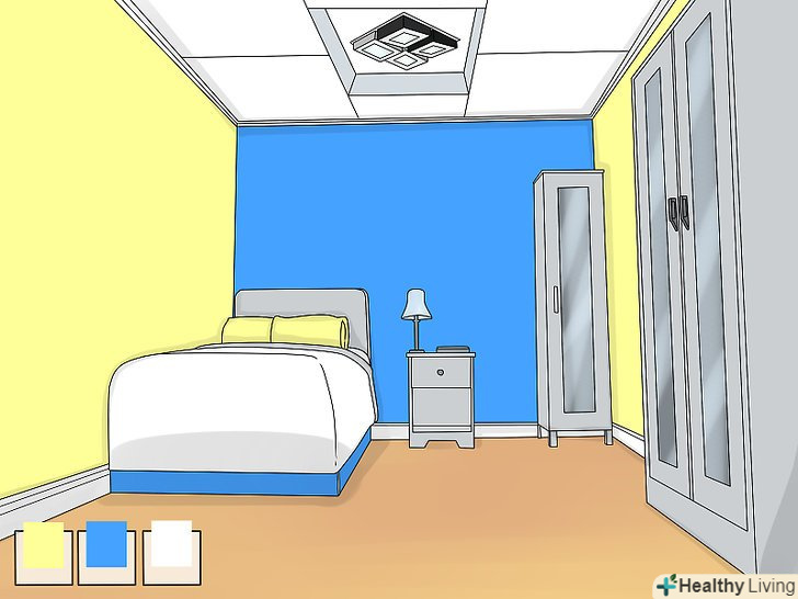 Виберіть 2-3 кольори для створення акцентів, які додадуть кімнаті різноманітність. підберіть пару кольорів, які добре поєднуються з обраним переважаючим кольором. Єдине оформлення кімнати можна створити за допомогою практично будь-якої комбінації кольорів, тому дайте волю своїй уяві. Доповнюють один одного кольору створюють гармонію, а контрастні можуть додатково акцентувати переважаючий колір. [9]- Наприклад, червоний і жовтий добре поєднуються один з одним, але стіни кімнати можна пофарбувати в блакитний, щоб привернути більше уваги до яскравого червоного декору.