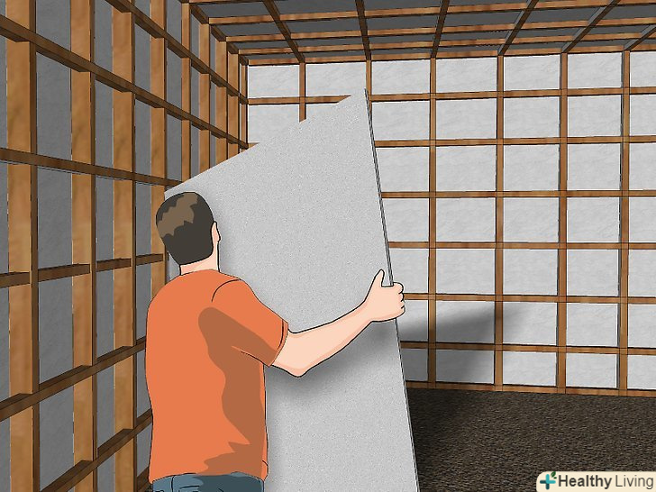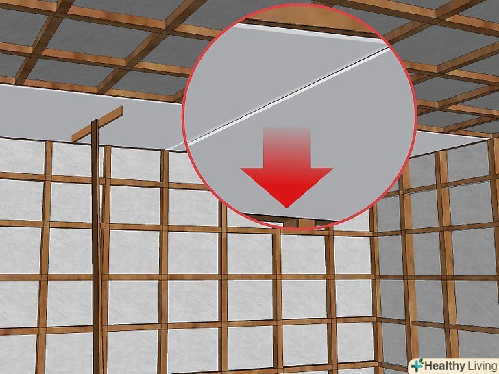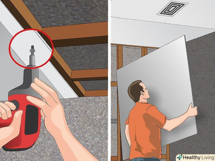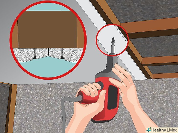 Намертво закріпіть листи гіпсокартону до стельових балок за допомогою цвяхів або шурупів. Головки обраних елементів кріплення повинні бути втоплені, але не прориватися через лист.