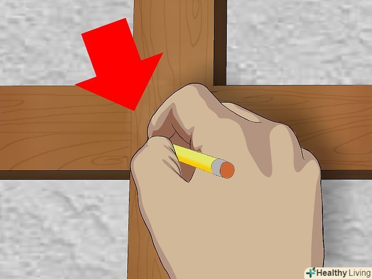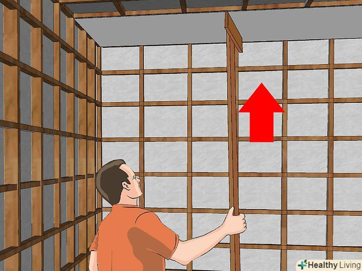 При необхідності зробіть t-подібну підставку. так ви отримаєте підйомний і опорний елемент, який необхідний для підйому листів гіпсокартону до стелі при роботі в поодинці. Візьміть планку довжиною 60 см з гранями 2,5 на 10 см і прибийте її до планки з гранями 5 на 10 см такої довжини, щоб вона була на 30 см вище, ніж відстань від підлоги до стелі.