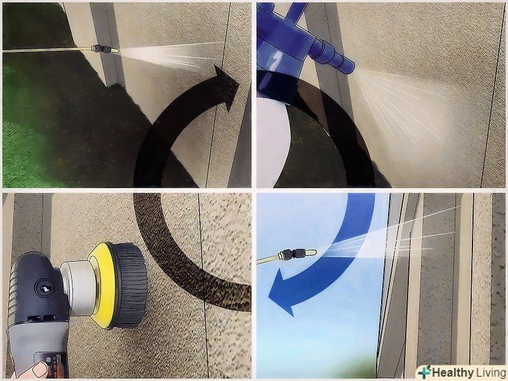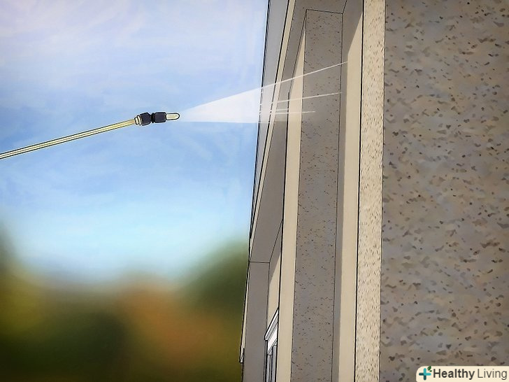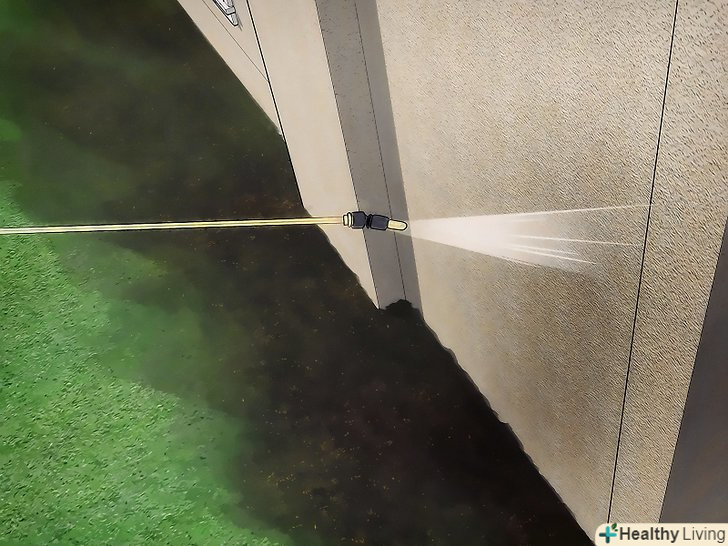 Змийте чистячий розчин з першої обробленої зони. приєднайте до мийки високого тиску насадку, що забезпечує знижений тиск розпилюється води. Потім змийте чистячий розчин з обробленої ділянки стіни, починаючи зверху і поступово просуваючись вниз. Вам буде видно, як відмоклі забруднення стікають по стіні. Дотримуйтесь струменем води за потоком бруду, проводжаючи його до самого низу. [9]- Ретельно помийте стіну, щоб на ній не залишилося будь-яких слідів чистячого розчину.