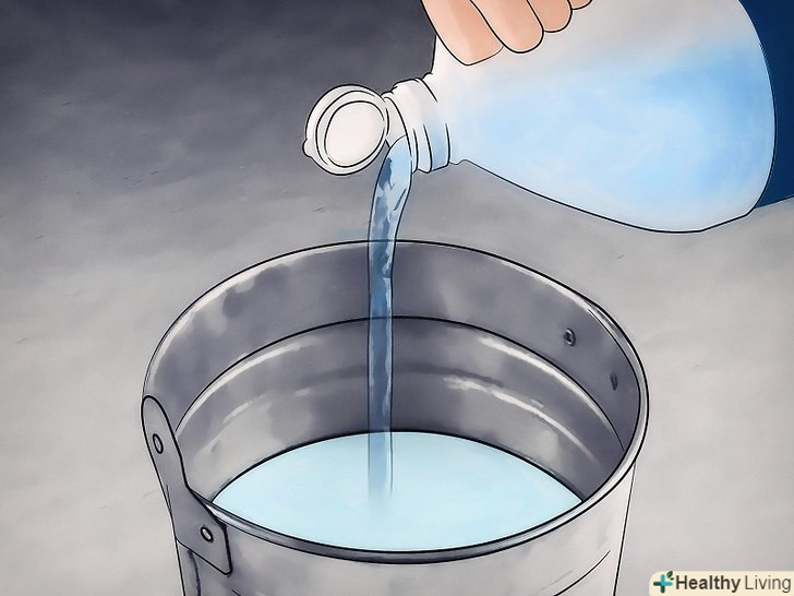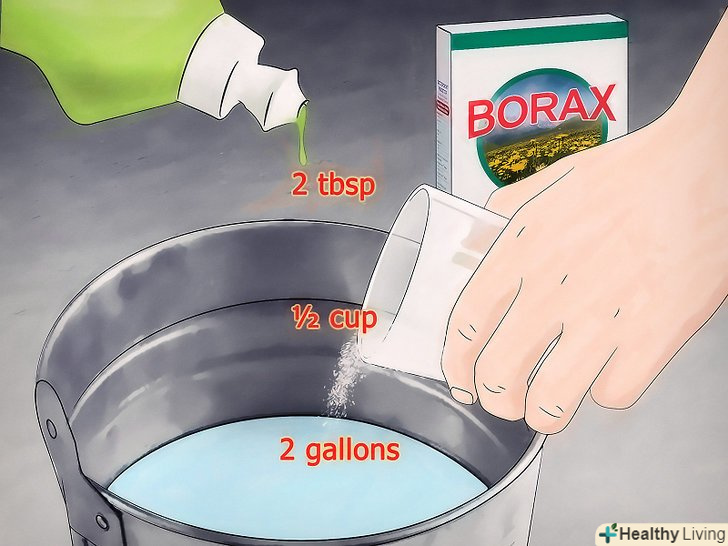Приготуйте чистячий розчин з бури і засоби для миття посуду. якщо ви вирішили відмовитися від спеціалізованих хімікатів і відбілювача, спробуйте самостійно приготувати чистячий розчин на основі Бури (тетраборату натрію). Бура відноситься до натуральних речовин. Вона менш токсична, ніж хлорний відбілювач, але настільки ж успішно бореться з цвіллю. [5] для підготовки чистячого розчину вам знадобиться всього три інгредієнти: гаряча вода, бура і засіб для миття посуду. Змішайте ці інгредієнти у великому відрі в кількості, зазначеній нижче:- 8 літрів теплої або гарячої води;
