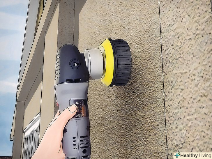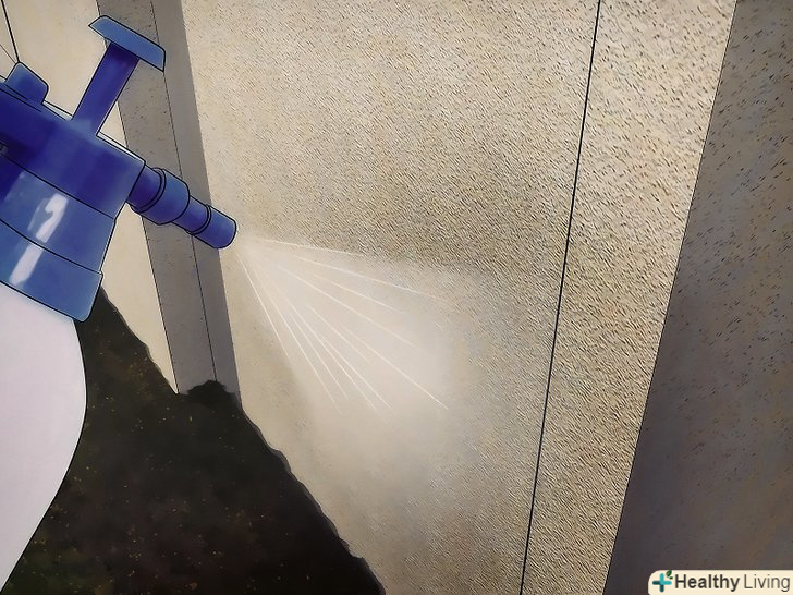 Розпиліть на штукатурку чистячий розчин. наповніть помповий Обприскувач миючим розчином. Поділіть поверхню стіни на кілька зон для зручності роботи. За допомогою помпового обприскувача нанесіть чистячий розчин на першу зону. Почніть знизу і рухайтеся вгору, поки не просочите розчином всю зону повністю.- Приділіть особливу увагу ділянкам з плямами.