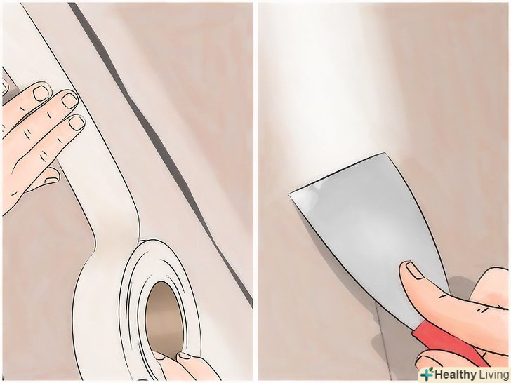 Закрийте штукатуркою краю нового шматка гіпсокартону і старої стелі. втисніть паперову стрічку в ще мокру шпаклівку і розрівняйте кельмою. Поверх стрічки нанесіть ще один шар шпаклівки і знову розрівняйте. Також можна закрити шпаклівкою головки шурупів.
