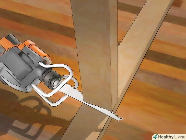 Після видалення гіпсокартону можна переходити до видалення дерев'яних стійок. Візьміть шабельну пилу і підпиляєте вертикальні стійки. Візьміться за кінці пилки і потягніть її наскільки можливо. Упевнившись, що полотно шабельної пилки здатне різати цвяхи, пройдіться пилкою уздовж підлогових і стінних плит, де закріплені вертикальні стійки, щоб перерізати цвяхи. Хто - небудь повинен підтримувати стійку, поки ви перерізаєте цвяхи.