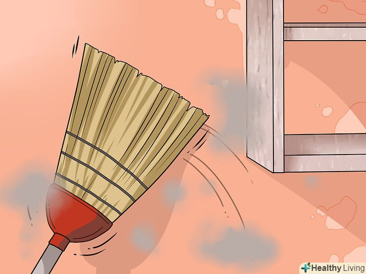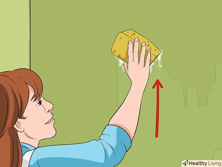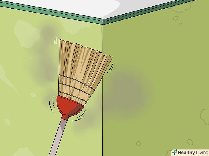 Очистіть стіни від пилу. скористайтеся віником, мітелкою або пилососом. Пройдіться обраним інструментом по стінах вертикальними рухами вгору і вниз. Щоб дістатися до стельових кутів, користуйтеся сходами або залучіть на допомогу високого друга. [1]- Якщо прути використовуваного віника або щітки занадто жорсткі, накрийте їх старою футболкою або іншою ганчіркою для прибирання, щоб не допустити появи подряпин на стінах. Періодично споліскуйте футболку або ганчірку або беріть нову, коли вона стає занадто брудною, щоб не рознести бруд по стінах!