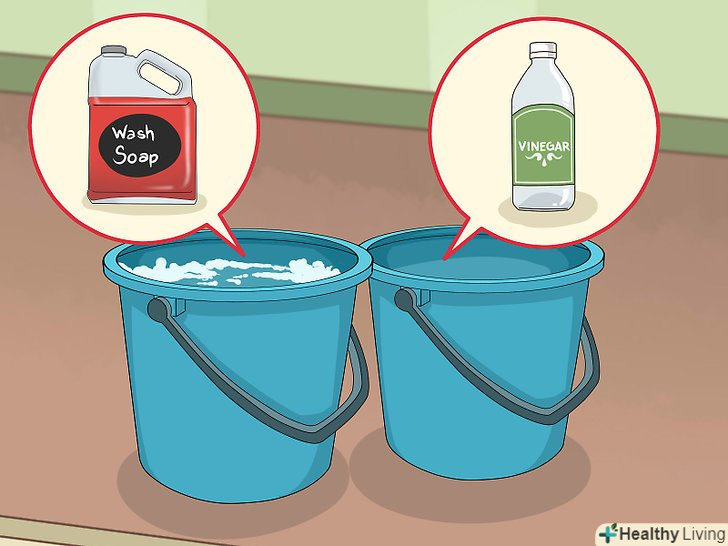 Вимийте стіни. для очищення більшості пофарбованих стін прекрасно підійде тепла мильна вода. Якщо вам потрібен більш потужний чистячий розчин, спробуйте додати у відро з теплою водою 240 мл дистильованого білого винного оцту. Оцет не залишить після себе ніяких слідів, тому не варто переживати про те, що його доведеться змивати. [3]- Підготуйте два відра для повноцінного очищення стін. Наповніть одне відро миючим розчином, а інше — чистою водою, якою ви повторно протрете стіни через 5 хвилин після застосування чистячого розчину. Не забувайте міняти воду, коли вона буде ставати занадто брудною, так як немає сенсу протирати стіни зібраної з них же брудом.