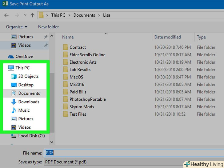 Виберіть папку для збереження.у лівій частині вікна клацніть по папці, в якій хочете зберегти PDF-файл.- Наприклад, щоб зберегти PDF-файл на робочому столі, на лівій панелі знайдіть і натисніть "робочий стіл".