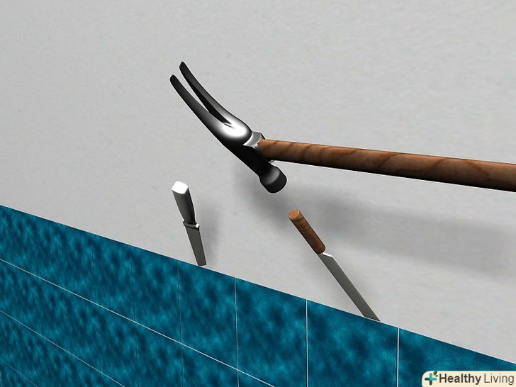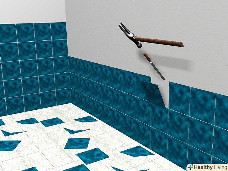 Зніміть плитку. ви можете використовувати один з наступних способів або спробувати обидва:- Відірвіть плитку від стіни. Цей спосіб хороший для видалення давно покладеної плитки, тому що розчин втрачає свою міцність з часом. Вставте щось тонке і міцне, як ніж для масла, між плиткою і стіною і акуратно потягніть, щоб відокремити плитку від стіни. Працюйте обережно, щоб не пошкодити краї сусідніх плиток і не створити необхідності відновлювати плитку.