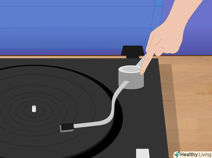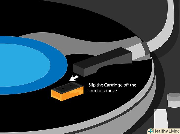 Зніміть головку з тонарма.більшість головок тримаються за допомогою кільця або гайки, які слід послабити, щоб зняти головку з тонарма. Може знадобитися від'єднати від роз'ємів звукознімача кілька кольорових дротів з коннекторами, якщо вони визирають з розташованого на голівці гнізда. Схему підключення можна буде знайти в коробці з новою головкою, тому можна не турбуватися про те, як були підключені проводки. Це потрібно робити з обережністю, як і у випадку багатьох інших дрібних електронних пристроїв, а проводки слід вирівняти відповідно до гніздами для більш легкої роботи. Коли головка від'єднана, скористайтеся ювелірної викруткою, щоб викрутити болтики.
