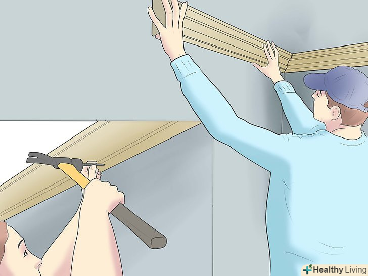 Вирівняйте розташування обох плінтусів, перш ніж прибивати їх. прикладіть до кута один плінтус, а потім заведіть в кут другий плінтус, поєднуючи кінці.- Вам може знадобитися внести невеликі корективи, щоб плінтуса краще прилягали один до одного. Ви повинні домогтися ідеального прилягання без дірок.