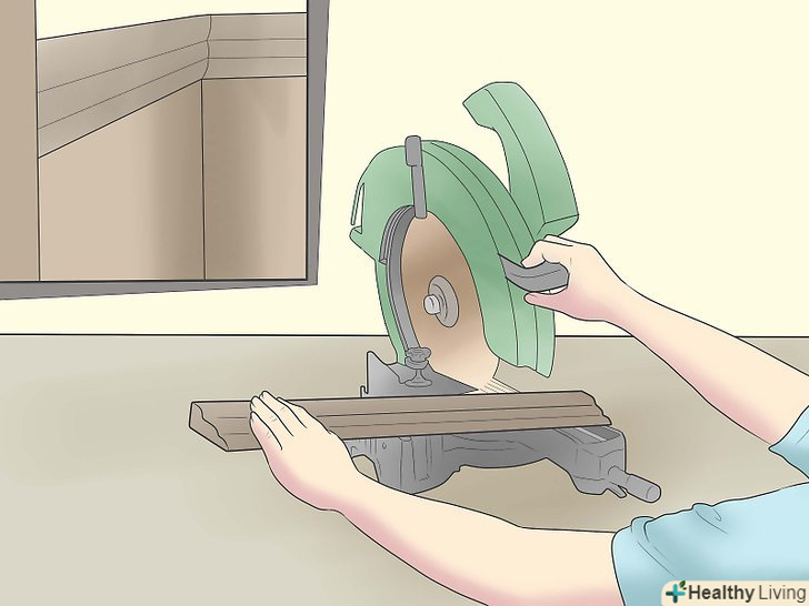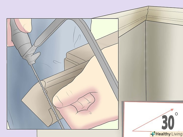 В якості альтернативи можна робити перший косий зріз за допомогою верстата для різання під кутом. [4] для економії часу початковий зріз можна робити на верстаті для різання під кутом, а решту доводити ручним лобзиком.- Для виконання косого зрізу помістіть плінтус нижньою стороною вгору в верстат для різання під кутом.