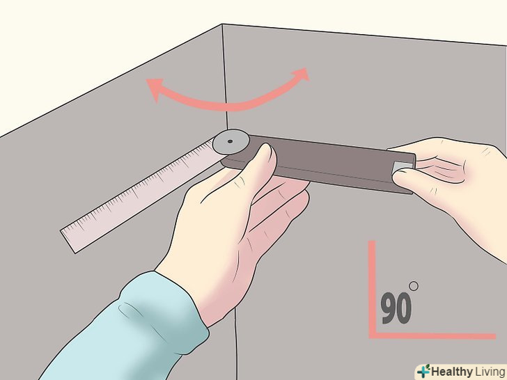 Виміряйте кут в градусах. використовуйте транспортир для точного визначення внутрішнього кута. Поділіть завмер навпіл, щоб отримати розмір кута, на який необхідно буде зрізати один з плінтусів.- Прикладіть праву сторону транспортира до однієї стіни в кутку і розкрийте другу сторону до кінця, поки вона не притиснеться до іншої стіни. Зауважте, що тримати транспортир слід паралельно стелі і підлозі.