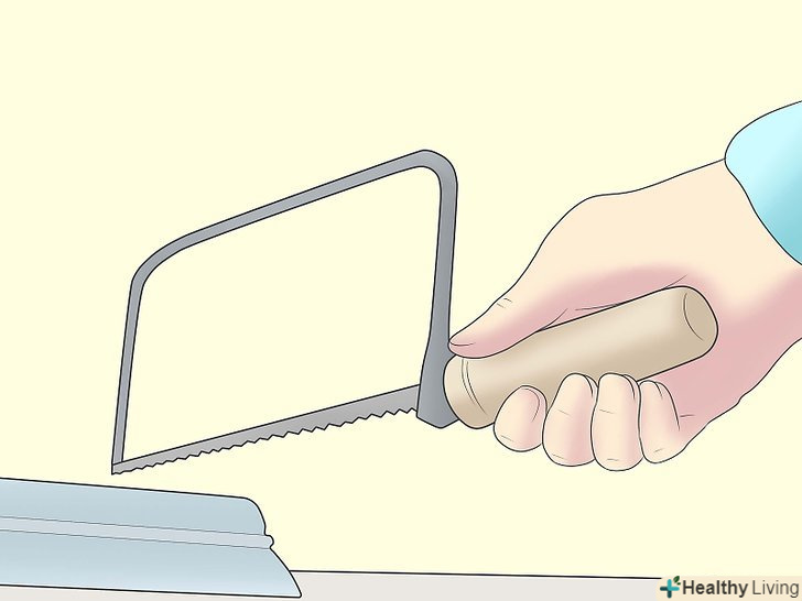 Обережно виконайте свій перший зріз. Направляйте лезо ручного лобзика великим пальцем під час виконання початкового зрізу.- Ваш лобзик повинен бути розташований перпендикулярно поверхні плінтуса при виконанні першого зрізу.