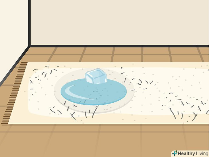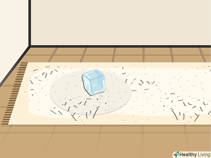 Покладіть на вм'ятину кубик льоду. дістаньте з морозильної камери один або кілька кубиків льоду. Для цього завдання можна використовувати один великий кубик або кілька кубиків поменше. Відразу після цього покладіть кубик на вм'ятину. Покладіть його прямо на килим. Між кубиком льоду і килимом не повинно нічого бути. [5]
