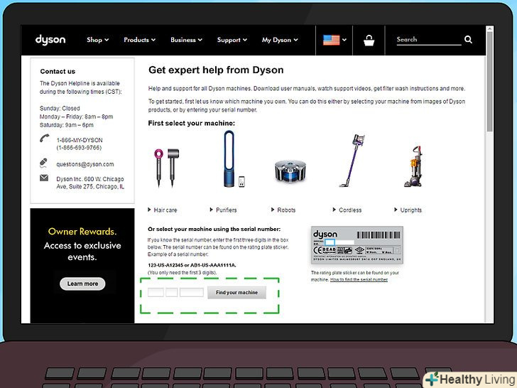 Знайдіть серійний номер свого пилососа. пошукайте наклейку на пристрої. Запишіть перші три цифри серійного номера, який вказаний на наклейці. Вона може перебувати в одному з наступних місць: на корпусі за шлангом, під підставою між колесами і за контейнером.- Якщо вам не вдається знайти наклейку, перейдіть за адресою: https://www.dyson.com.ru/registeryourmachine/serial-number-lookup.aspx?showoverlay=true .