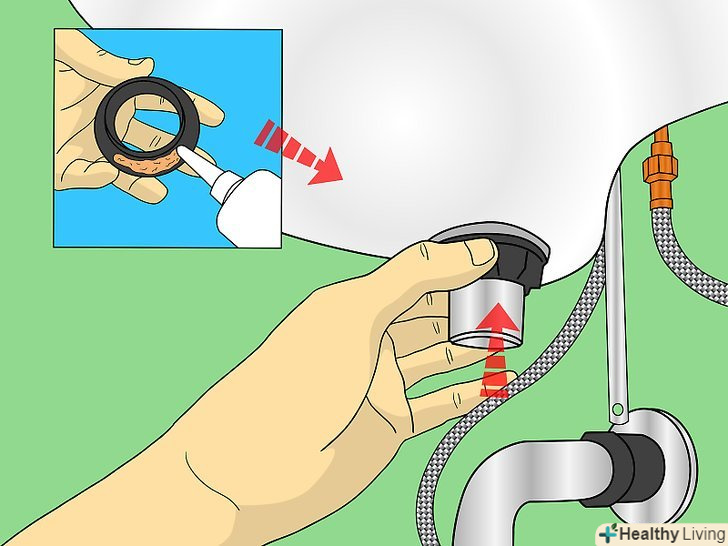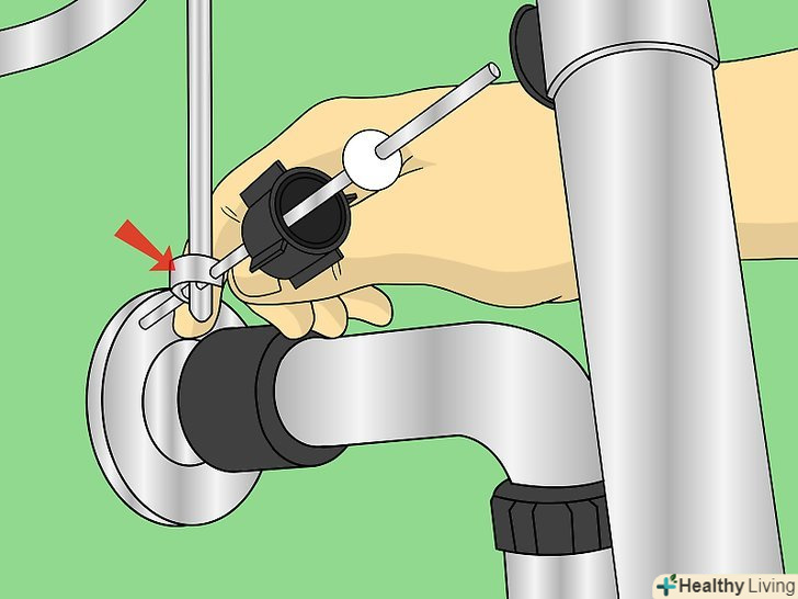 Встановіть новий зливний патрубок по центру дренажного отвору раковини. помістіть прокладку на кінчик патрубка і закрутіть гайку для закріплення труби в установленому місці.