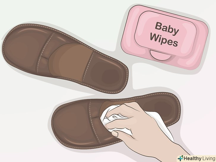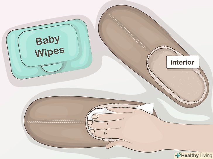 Для очищення внутрішньої частини тапочок використовуйте дитячі серветки. якщо підкладка шкіряних тапочок виконана з бавовни або флісу, скористайтеся тим же методом її очищення, який згадувався в описі Чищення замшевих тапочок з тканинною підкладкою. А саме, візьміть для це дитячі вологі серветки, які містять в собі невелику кількість вологи і щадне засіб для чищення. [30] використовуйте пару таких серветок для протирання внутрішньої сторони тапочок до тих пір, поки на серветках не перестануть залишатися сліди бруду.- В якості альтернативи ви можете зволожити звичайну ганчірочку і капнути на неї 1-2 краплі засобу для прання вовни або іншого м'якого мила, наприклад, дитячого шампуню, щоб потім протерти тапочки зсередини. [31] даний метод зажадає використання другої вологої ганчірочки для подальшого видалення слідів мила.