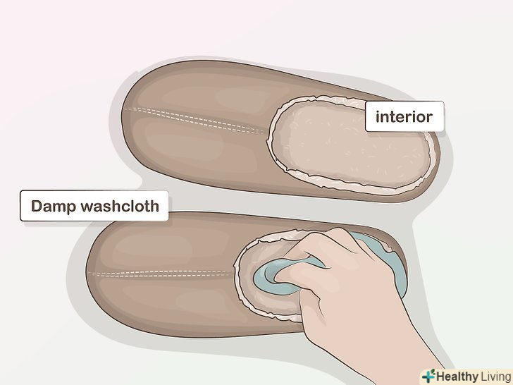 Для видалення залишків миючого засобу з внутрішньої частини тапочок скористайтеся чистою вологою ганчіркою. після очищення тапочок зсередини візьміть чисту вологу ганчірочку і повторно протріть тапочки. Ви повинні прибрати з внутрішньої поверхні тапочок залишки миючого засобу. Дитячі вологі серветки містять досить щадні речовини, тому при їх використанні даний крок не є обов'язковим, але він необхідний в тому випадку, якщо ви користувалися миючим засобом для вовни або шампунем. [22]